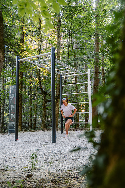 Jede Station ist mit anschaulichen Bildern und QR-Codes ausgestattet, die bei Bedarf Videos mit der korrekten Übungsausführung anzeigen – ideal für eine sichere und effektive Trainingseinheit. Das Programm umfasst Aufwärm- und Dehnübungen, sodass ein ganzheitliches Training möglich ist. Für Kinder sind die Geräte ab einer Körpergröße von 1,40 Metern geeignet. Der Rostwald bietet zudem viele weitläufige Wege, die sich hervorragend für Ausdauertraining eignen.