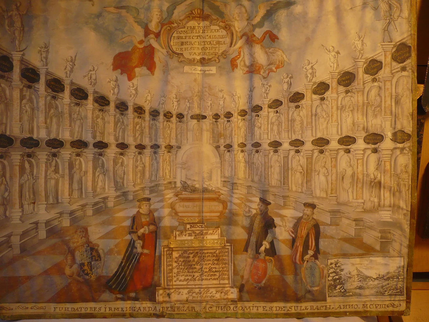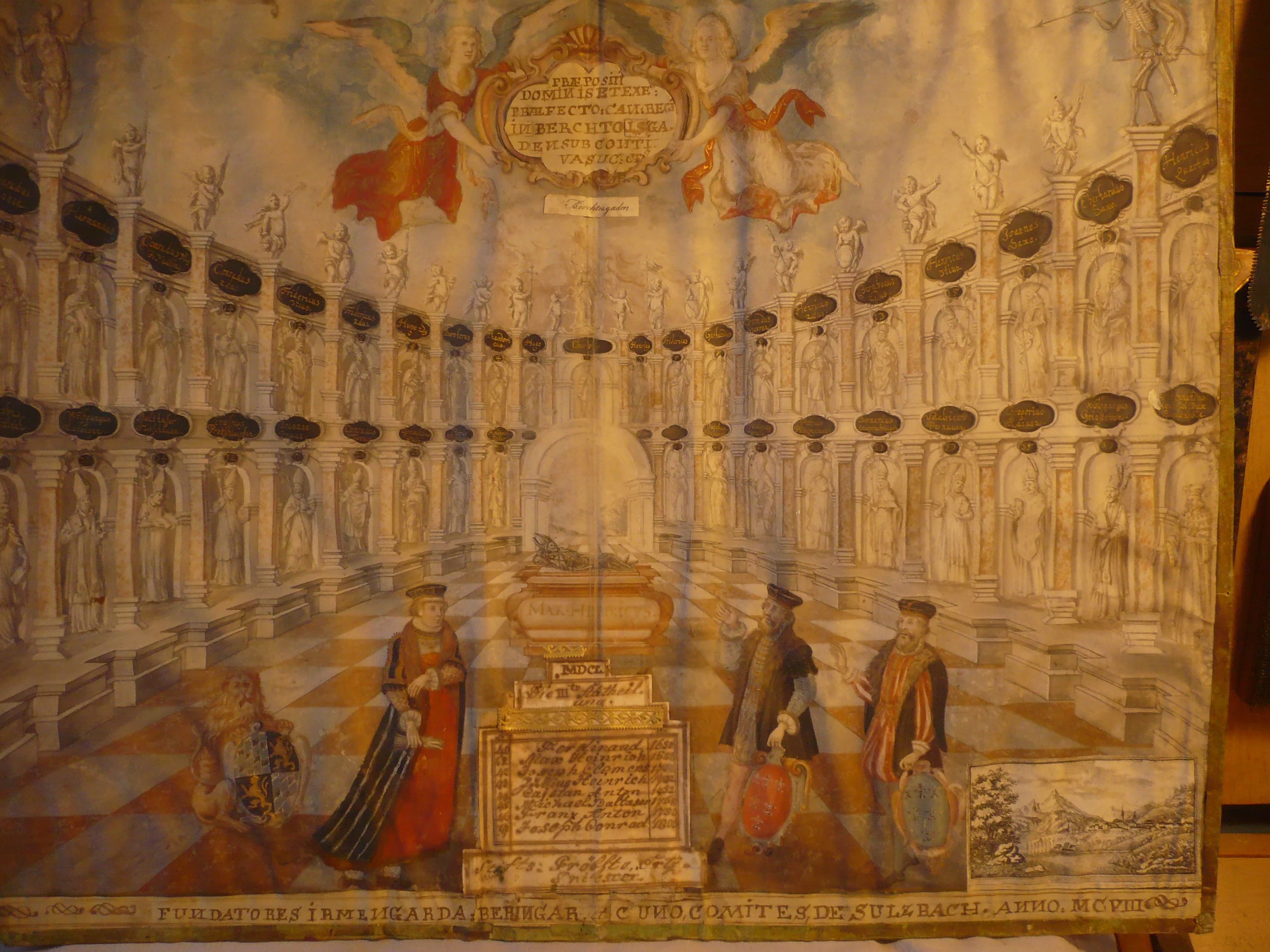 Als im Jahr 1688 der vorletzte Wittelsbacher Probst Max Heinrich verstorben ist, wurde eine Idealarchitektur geschaffen, die sämtliche seiner Vorgänger darstellt. Nach nun über 300 Jahren wurde das Dokument profesionell restauriert um es auch noch viele weitere Jahre für die Nachwelt erhalten zu können. Die es-Bürgerstiftung Bischofswiesen unterstützte hierbei den Verein der Freunde des Heimatmuseums Berchtesgaden e. V. finanziell mit der Übernahme der Restaurationsrechnung in Höhe von 620 €. Das restaurierte Objekt kann ab sofort wieder im Fürstprobstzimmer des Museums Schloss Adelsheim bestaunt werden.