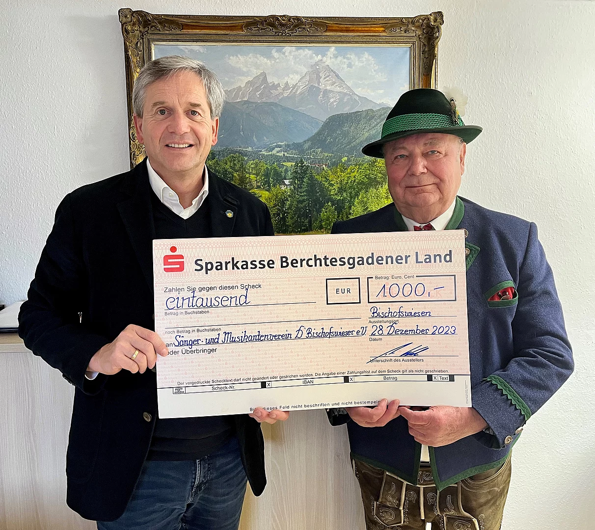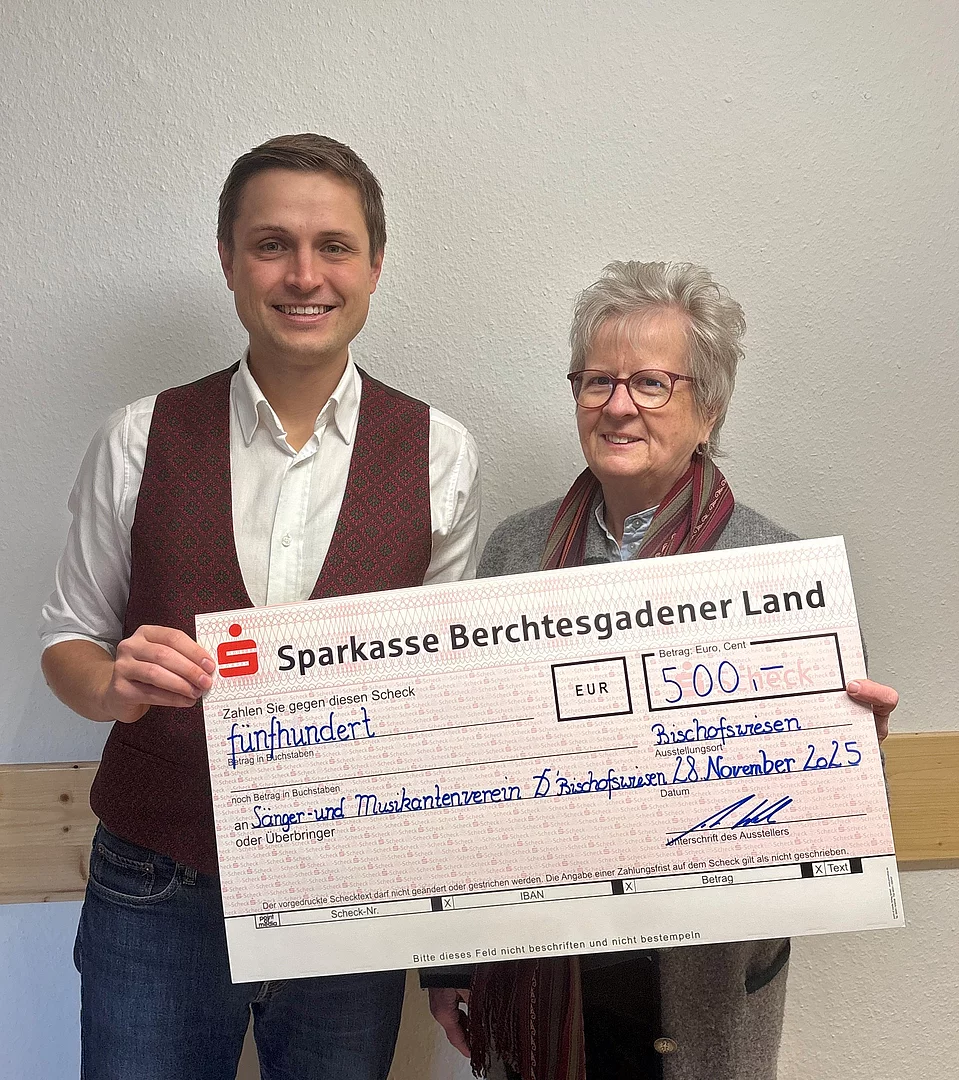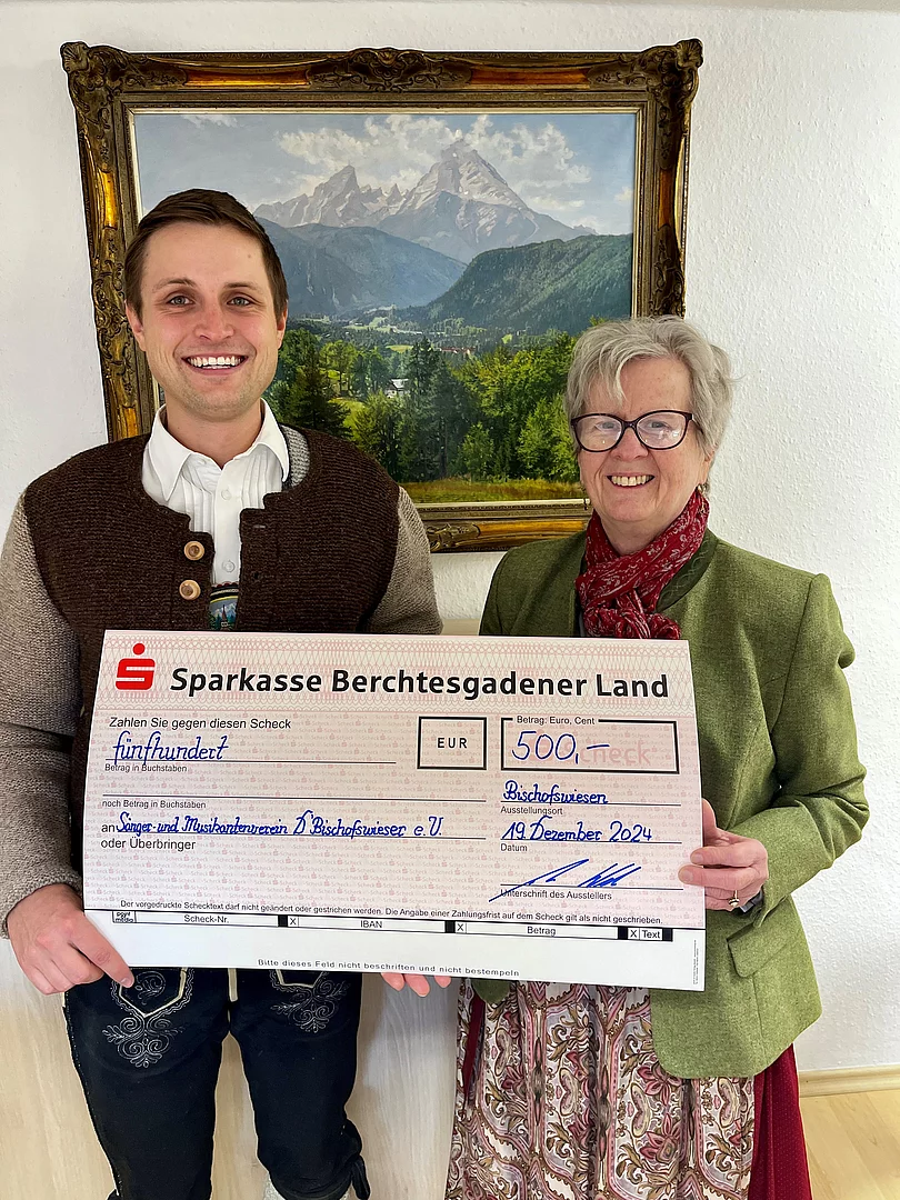 Der Sänger- und Musikantenverein D´Bischofswieser e. V. durften im Jahr 2023 sein 50-jähriges Bestehen feiern. Im Rahmen der Bergweihnacht am 28. Dezember 2023 übergab der Vorsitzende des Stiftungsvorstands Thomas Weber an den Vereinsvorsitzenden Willy Ebneth einen Spendenscheck zur Förderung der Musik und vor allem der Jugendarbeit.