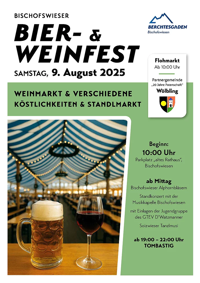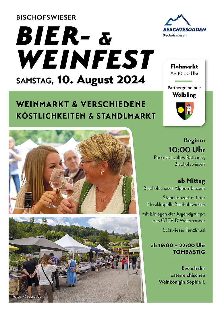 Am Samstag, den 10. August 2024 findet am Rathausplatz in Bischofswiesen das traditionelle Bier- und Weinfest statt (https://www.bischofswiesen.de/berchtesgadenerland-aktuelles/bier-und-weinfest-bischofswiesen.htm).