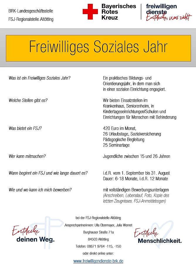 Falls ihr Interesse an einem freiwilligen sozialen Jahr habt, könnt ihr euch gern unter www.freiwilligendienste-brk.de oder telefonisch unter 08671 9764-115 oder -150 informieren, siehe Flyer.