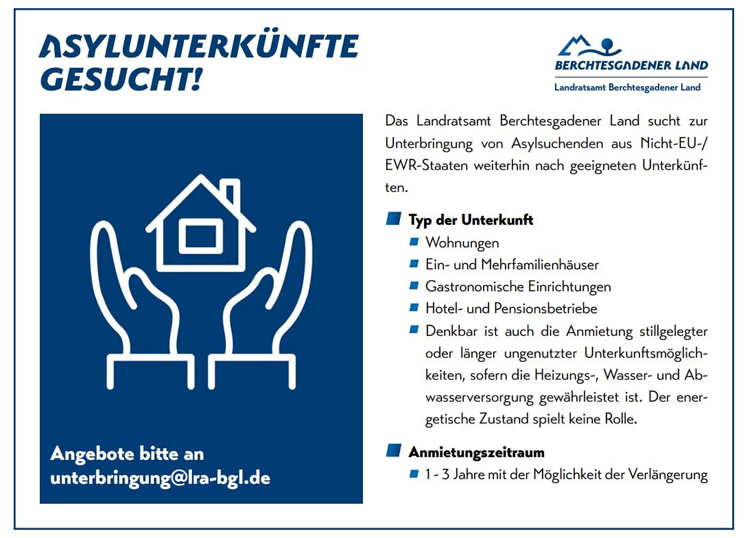 Das Landratsamt Berchtesgadener Land sucht zur Unterbringung von Asylsuchenden aus Nicht-EU-/ EWR-Staaten weiterhin nach geeigneten Unterkünften.