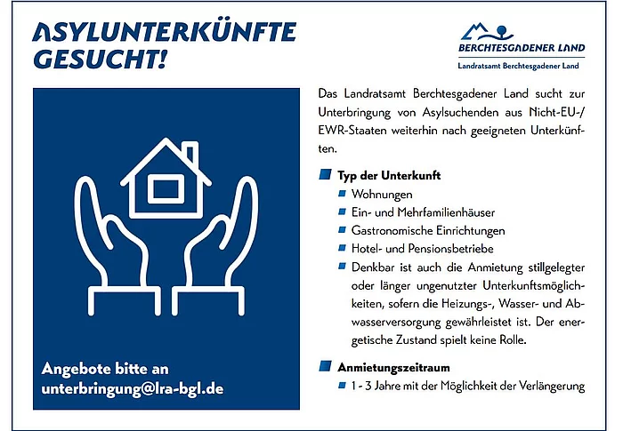 Das Landratsamt Berchtesgadener Land sucht zur Unterbringung von Asylsuchenden aus Nicht-EU-/ EWR-Staaten weiterhin nach geeigneten Unterkünften.Typ der Unterkunft: WohnungenEin- und MehrfamilienhäuserGastronomische EinrichtungenHotel- und PensionsbetriebeDenkbar ist auch die Anmietung stillgelegter oder länger ungenutzter Unterkunftsmöglichkeiten, sofern die Heizungs-, Wasser- und Abwasserversorgung gewährleistet ist. Der energetische Zustand spielt keine Rolle. Anmietungszeitraum: 1 - 3…